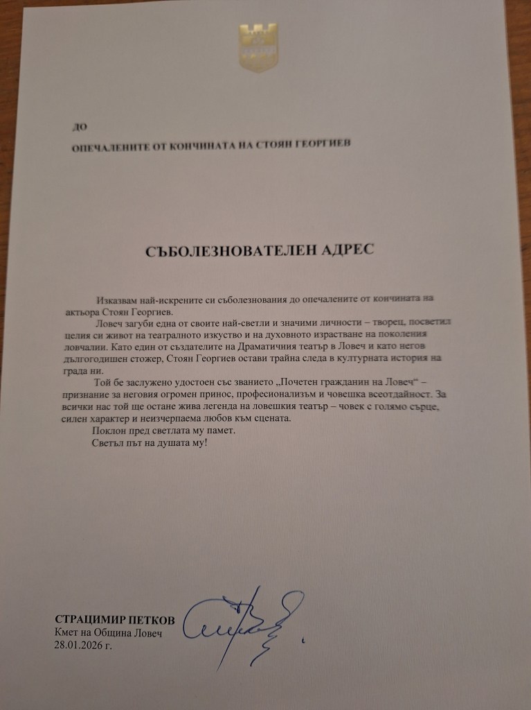 Обществеността на Ловеч отдаде поклон на 28 януари 2026 г. пред делото на актьора Стоян Георгиев (78 г.).Той беше сред създателите на театъра, дългогодишен председател на читалищното настоятелство и на Клуба на дейците на културата. Опелото се състоя в централния храм „Св. св. Кирил и Методий“, цветя и венци бяха поднесени пред театъра. Множеството изпрати актьора с бурни аплодисменти, каквито той заслужава като талант, организатор и вдъхновител. Той изгоря на 23 януари в буквалния и метафоричния смисъл на думата, споделиха негови приятели.